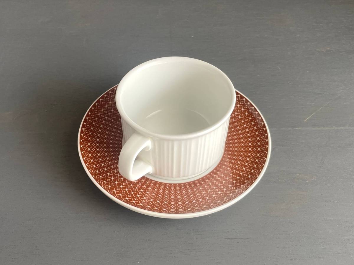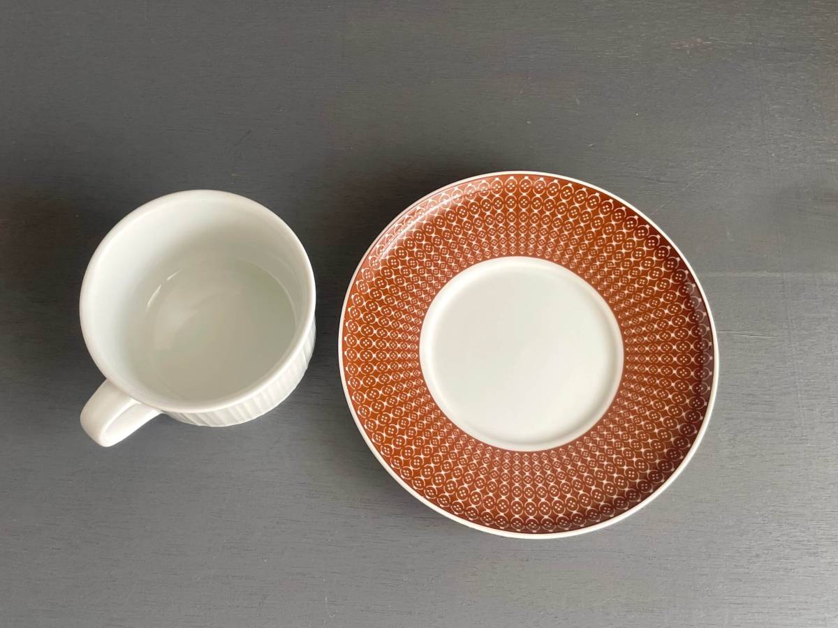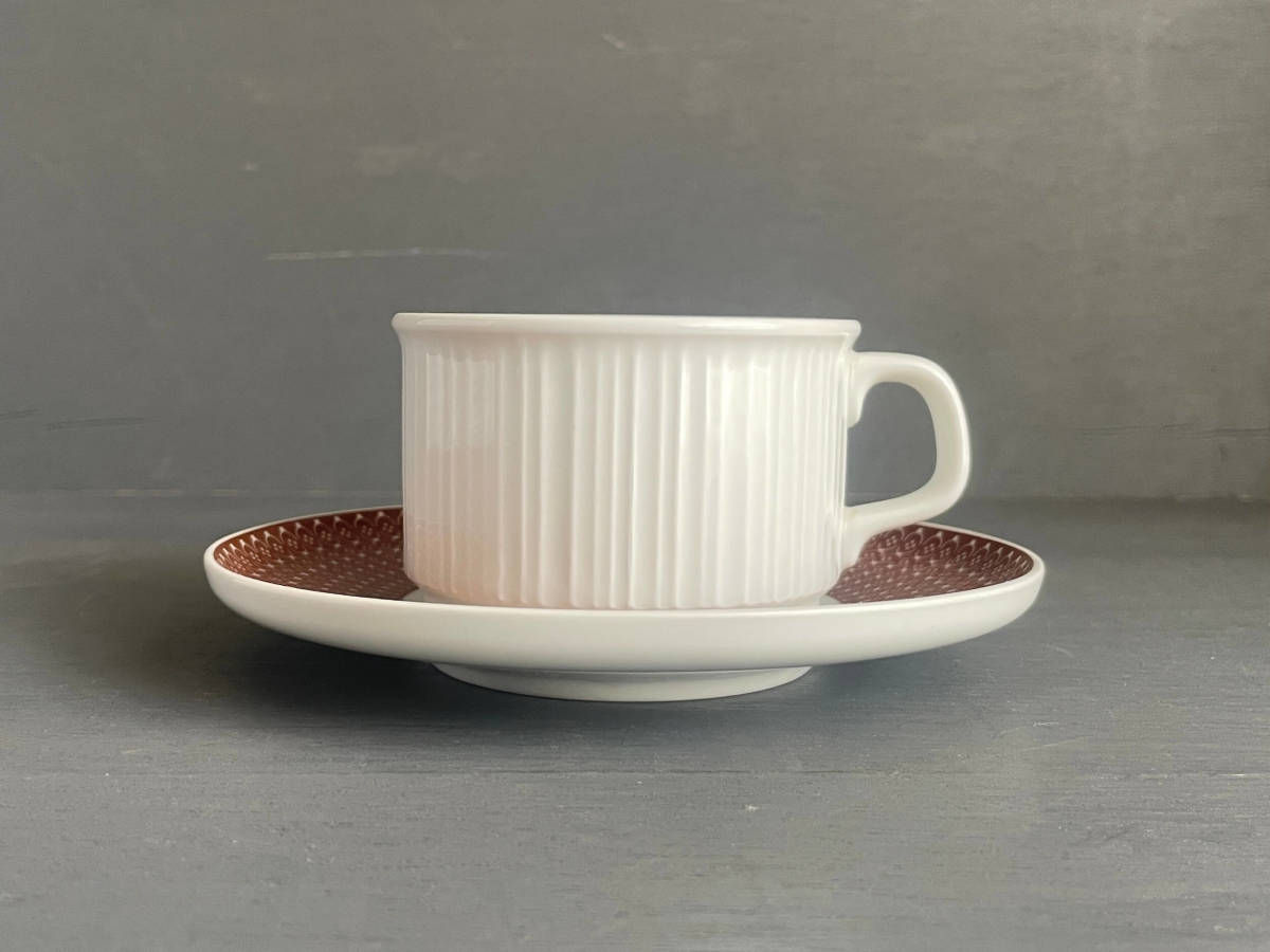 白地に側面のシンプルなラインが特徴的なカップとソーサーにはアラベスク模様のようなパターン。
