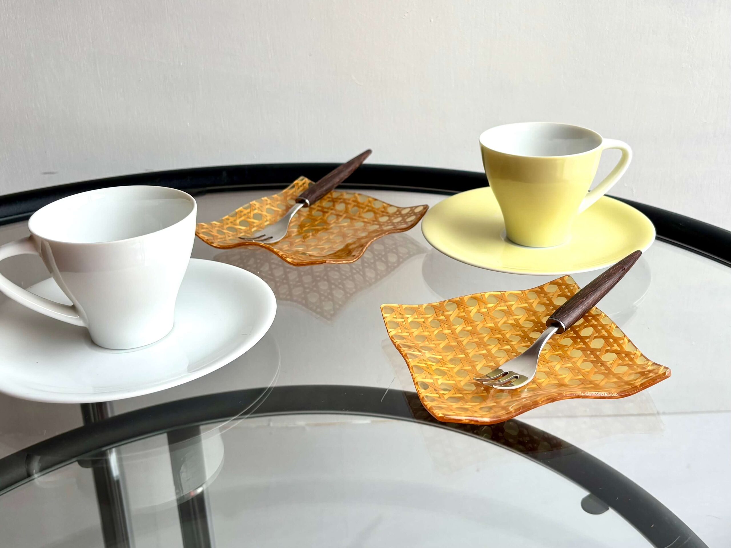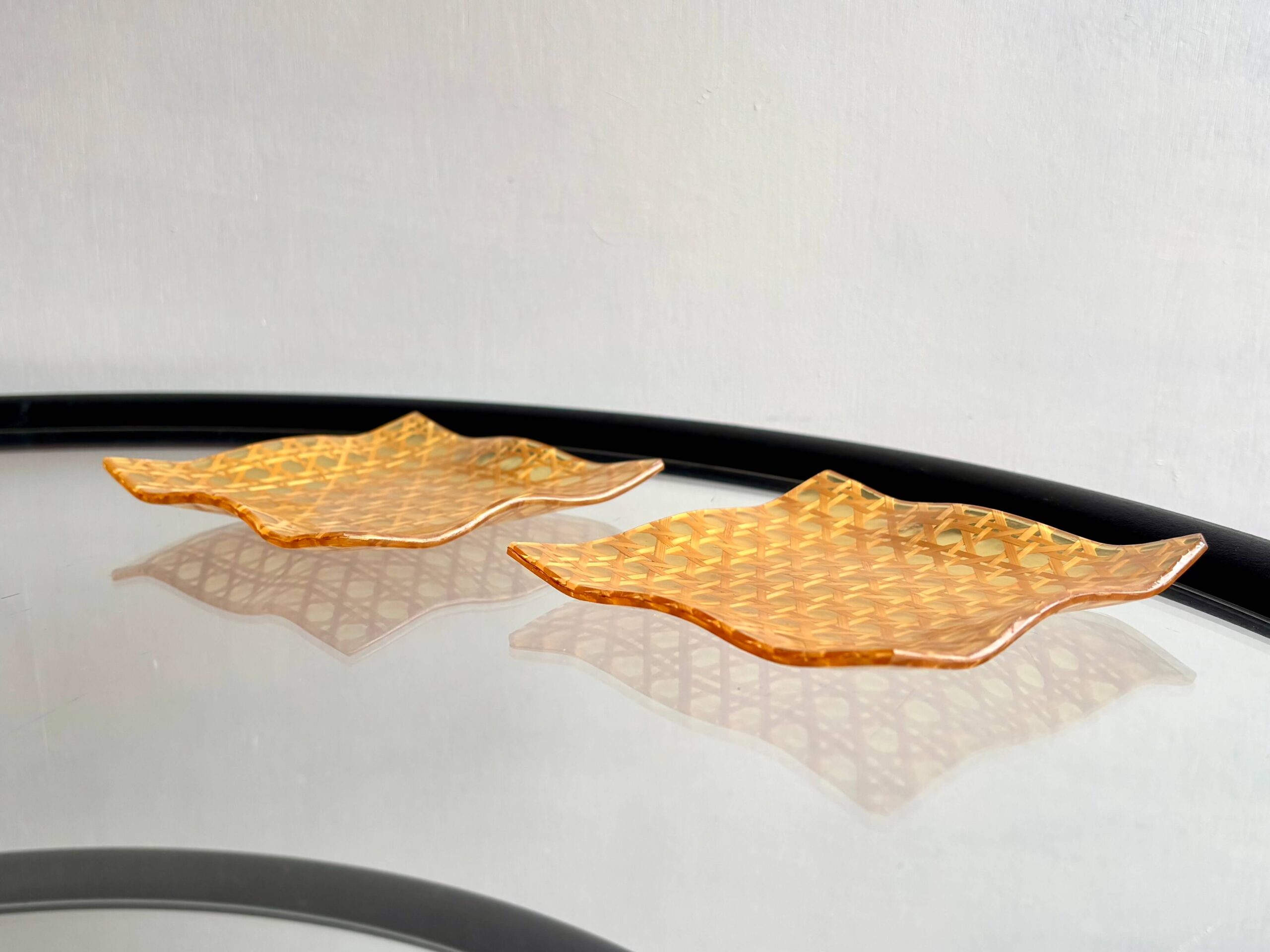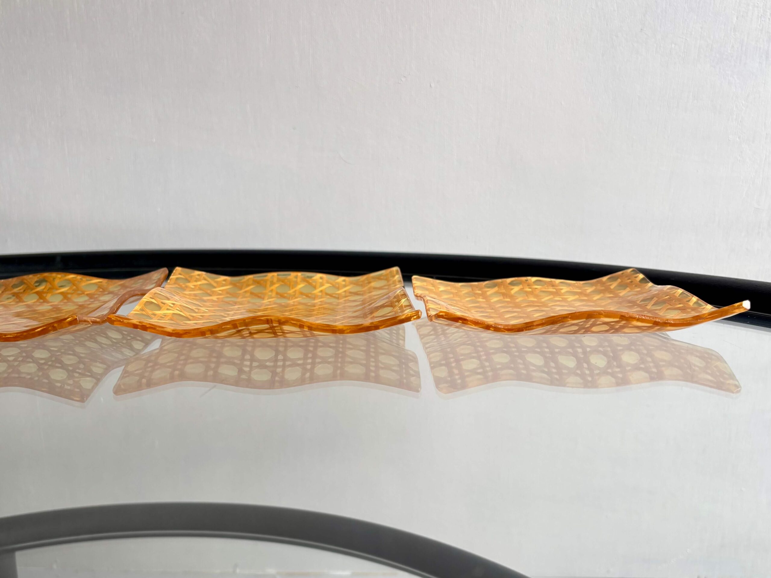端正に組まれたカゴ目の竹をポリエステル樹脂でとじこめたヴィンテージトレイ。