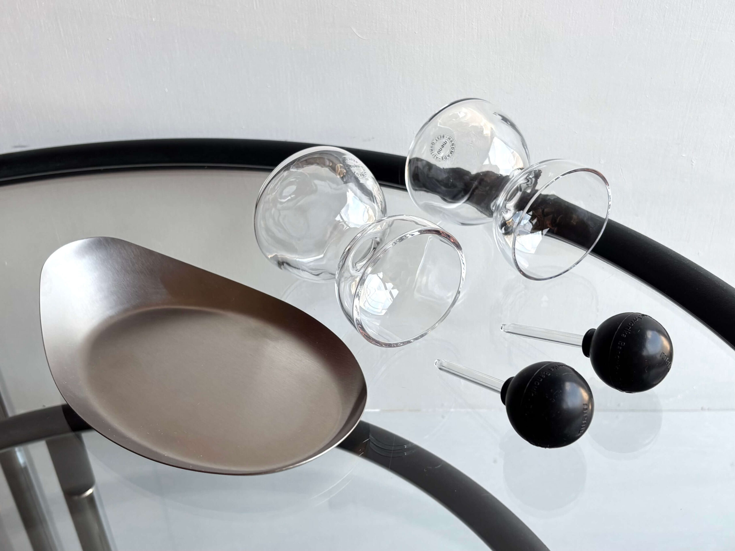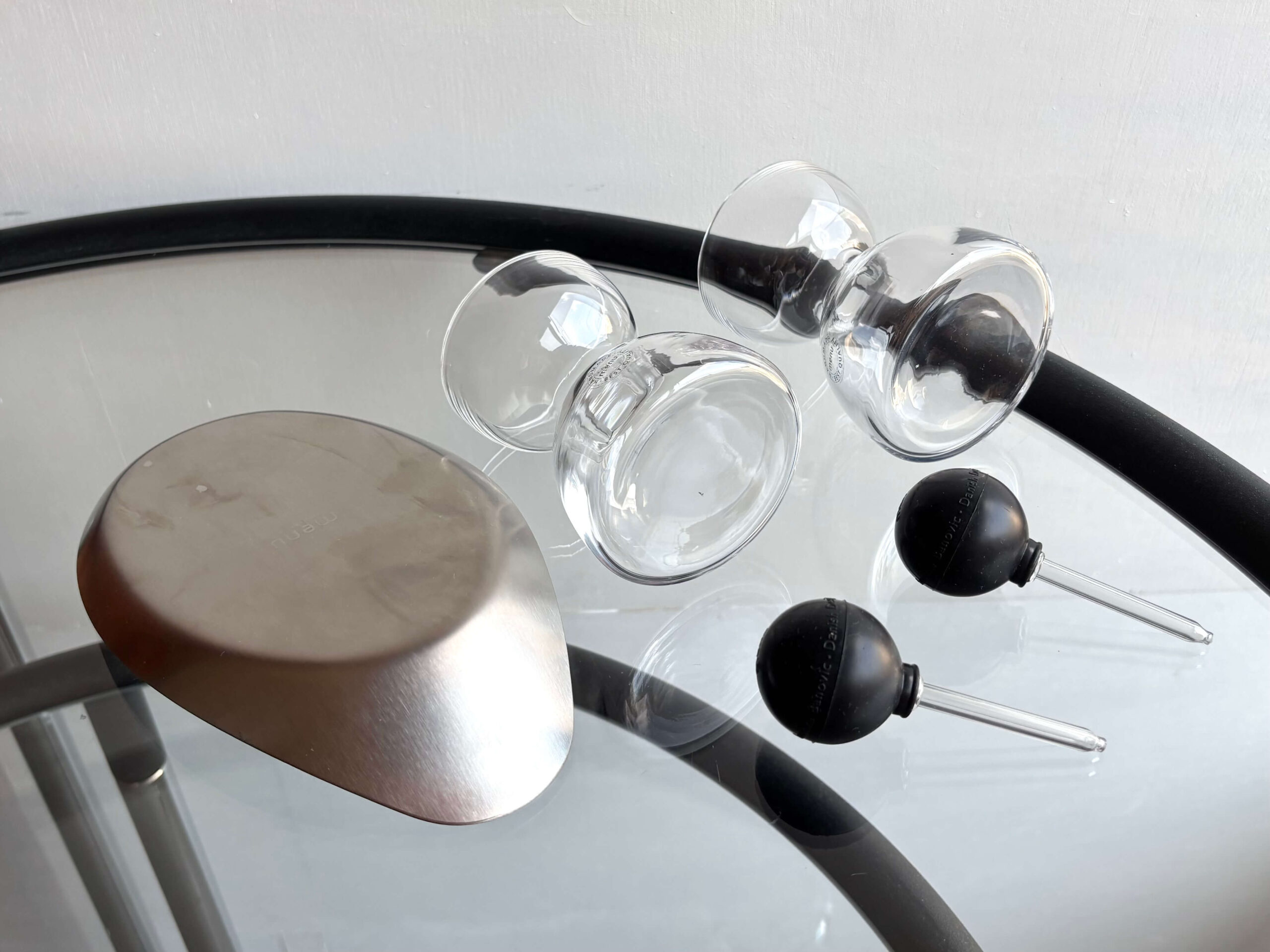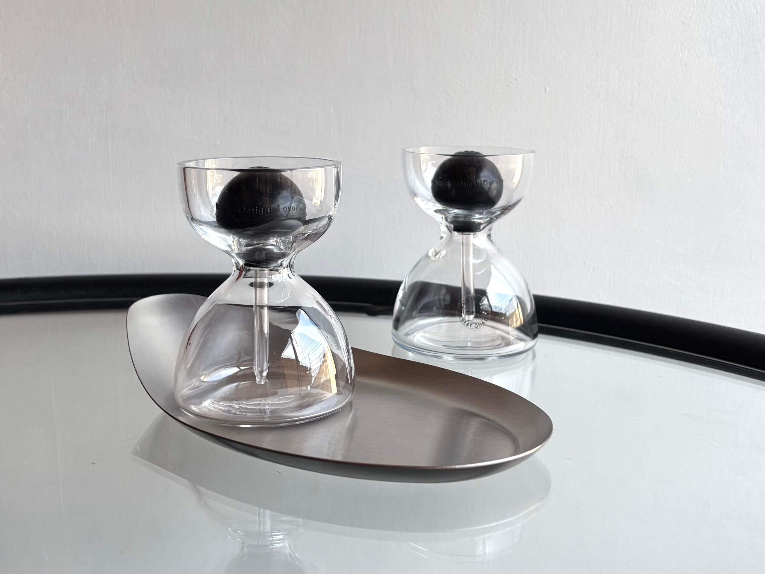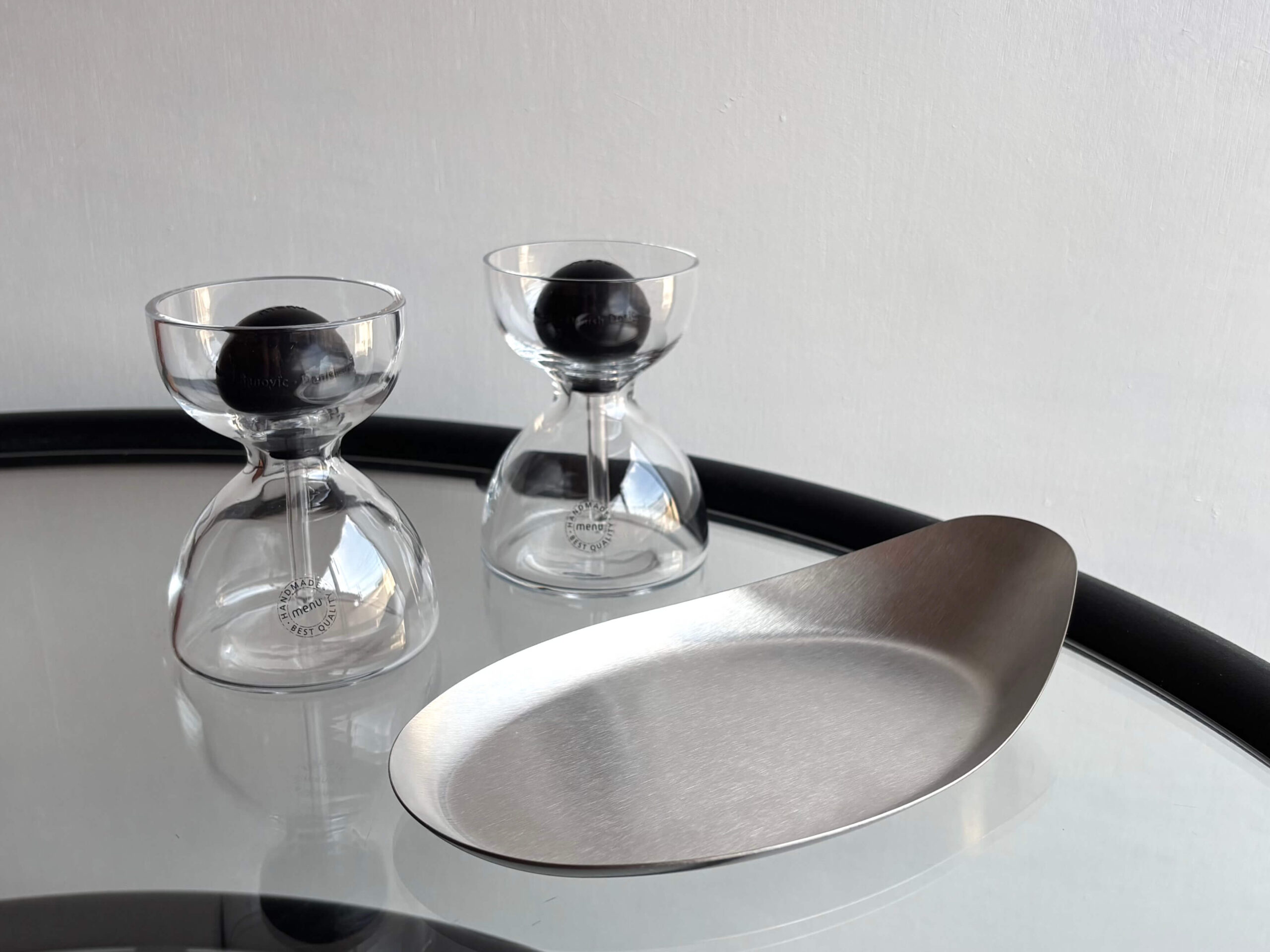 スマートなフォルムの調味料入れ本体/蓋とセットになっているピペットガラス×2、トレイ×1の3点セット。