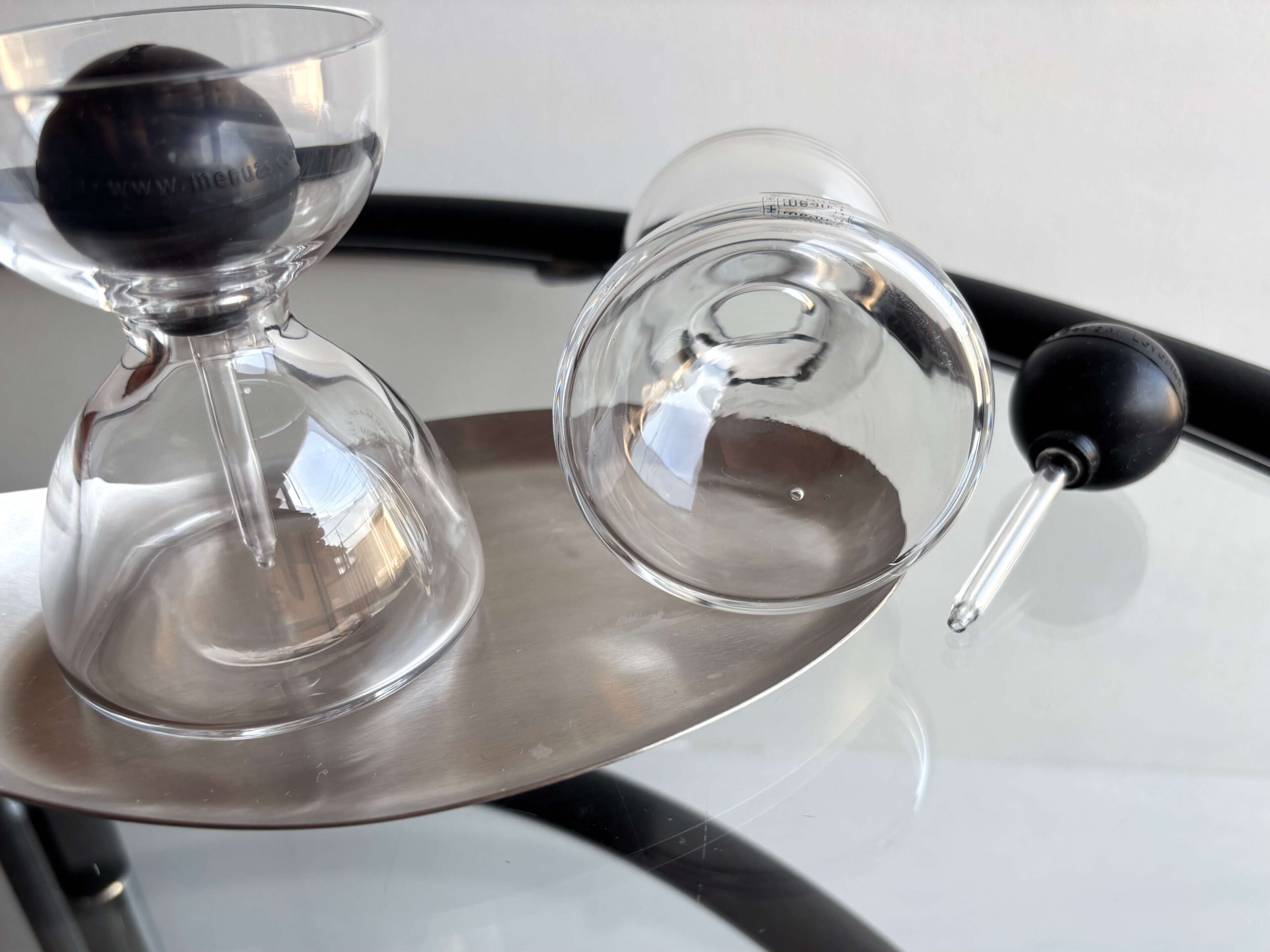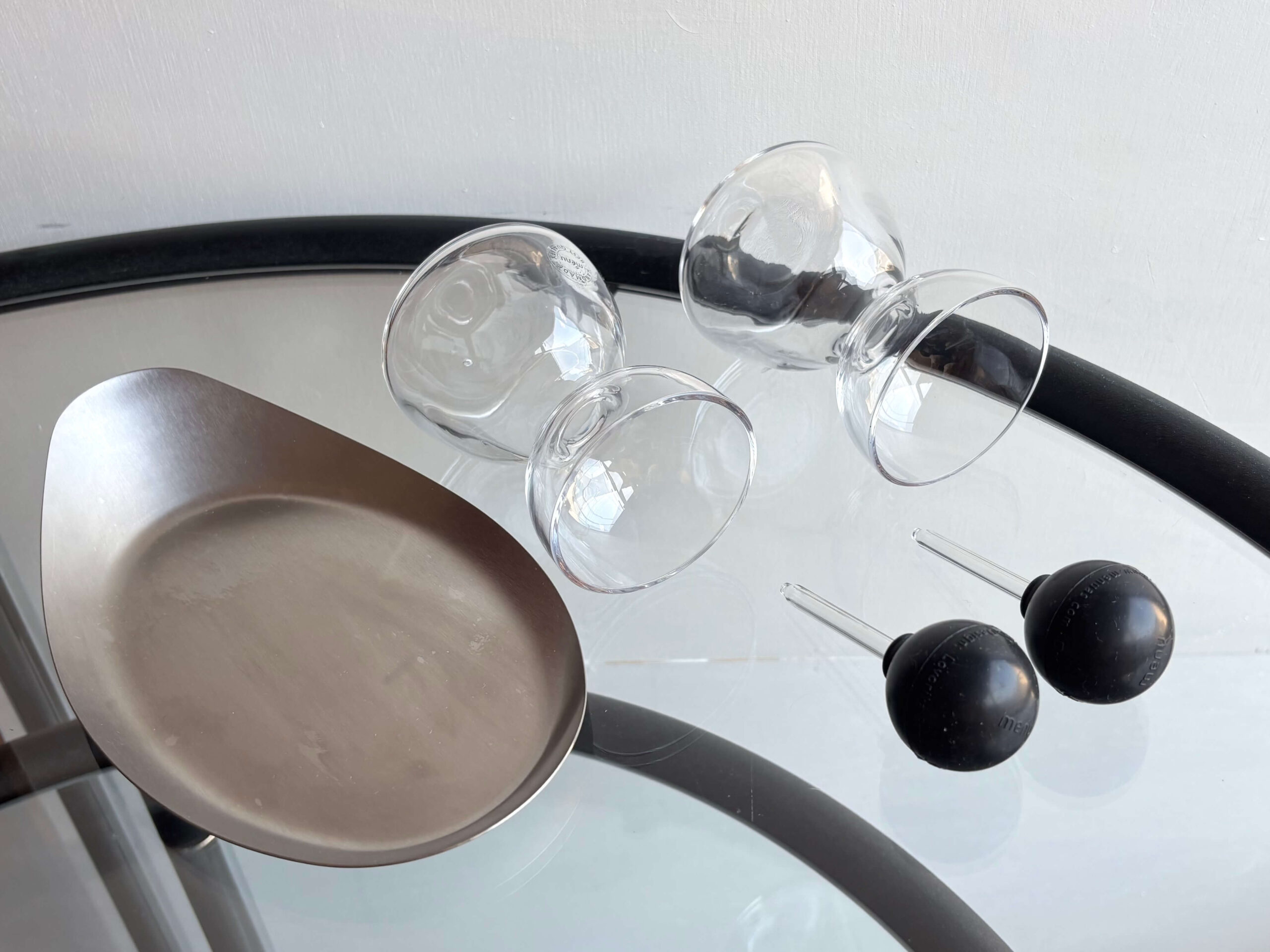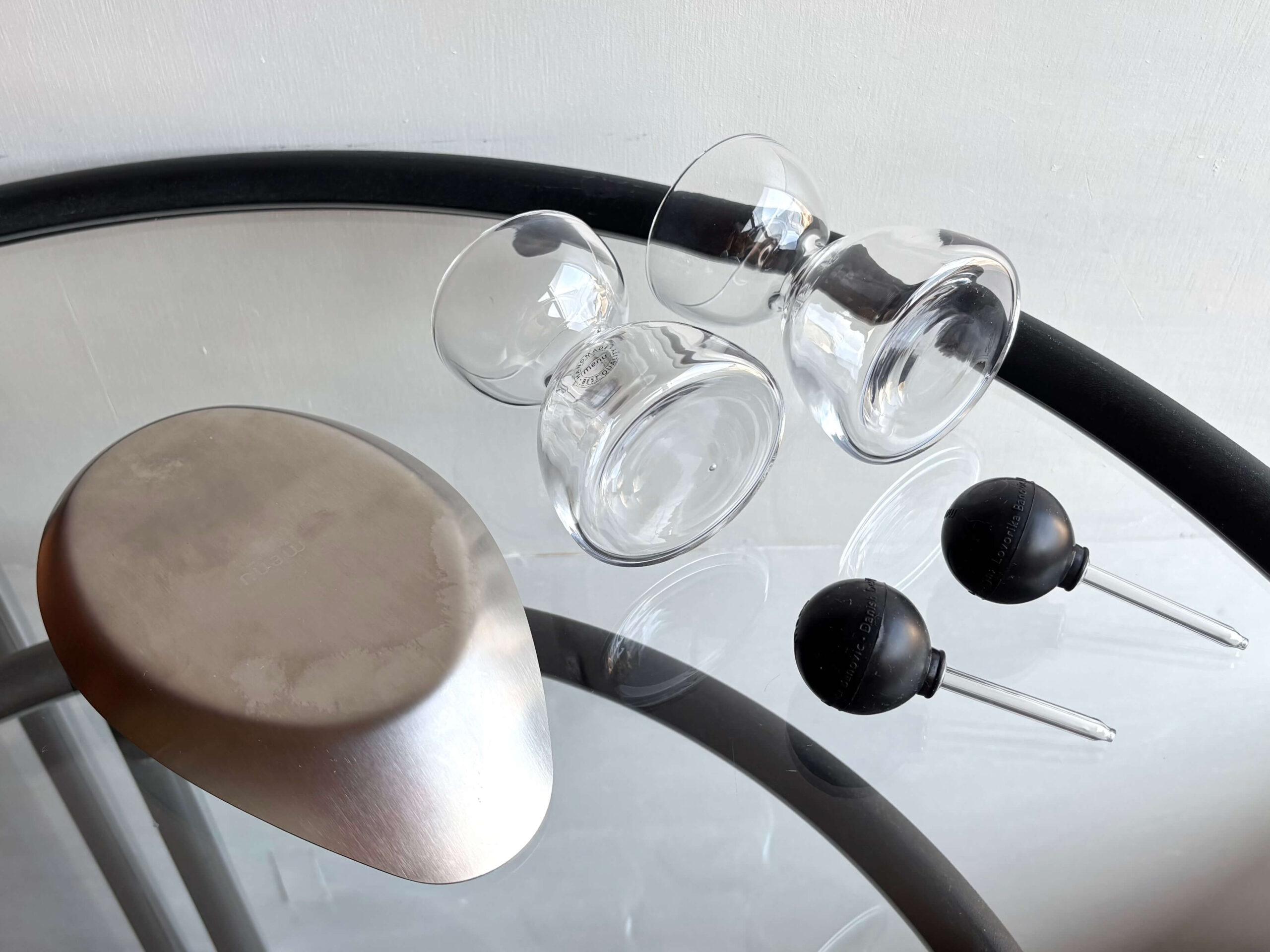 スマートなフォルムの調味料入れ本体/蓋とセットになっているピペットガラス×2、トレイ×1の3点セット。