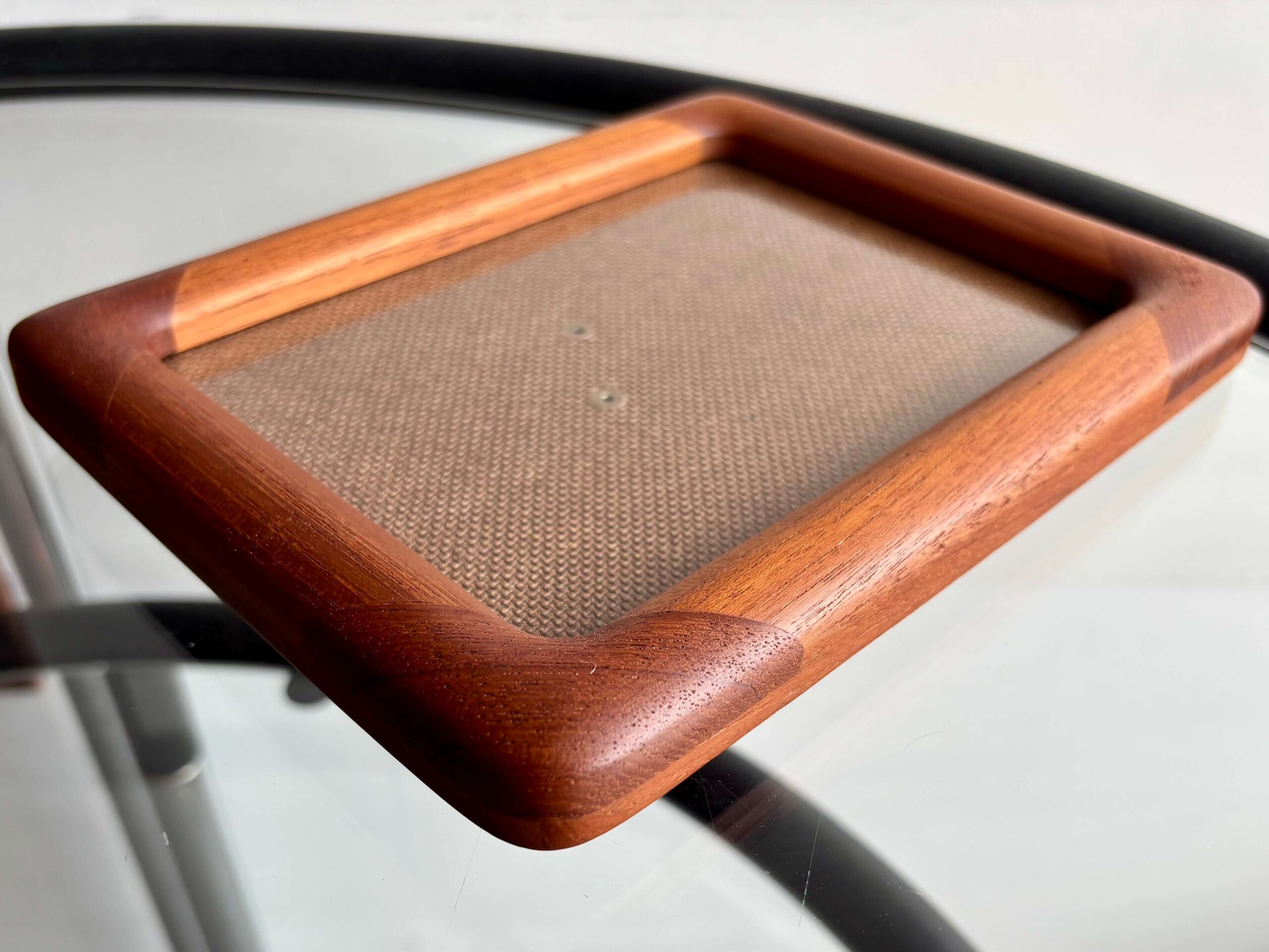 四隅は斜めにチーク材が集成され、美しい模様。
