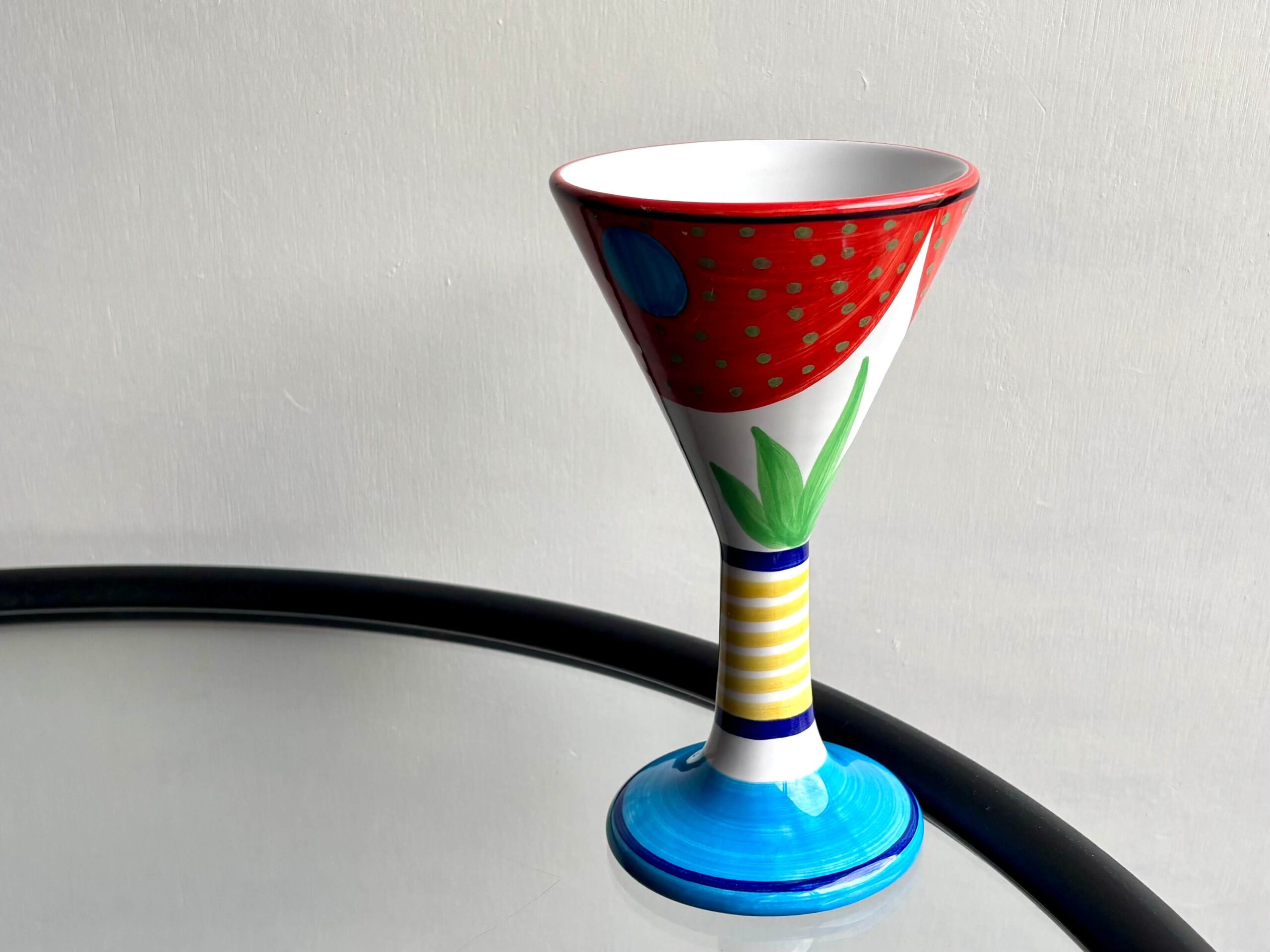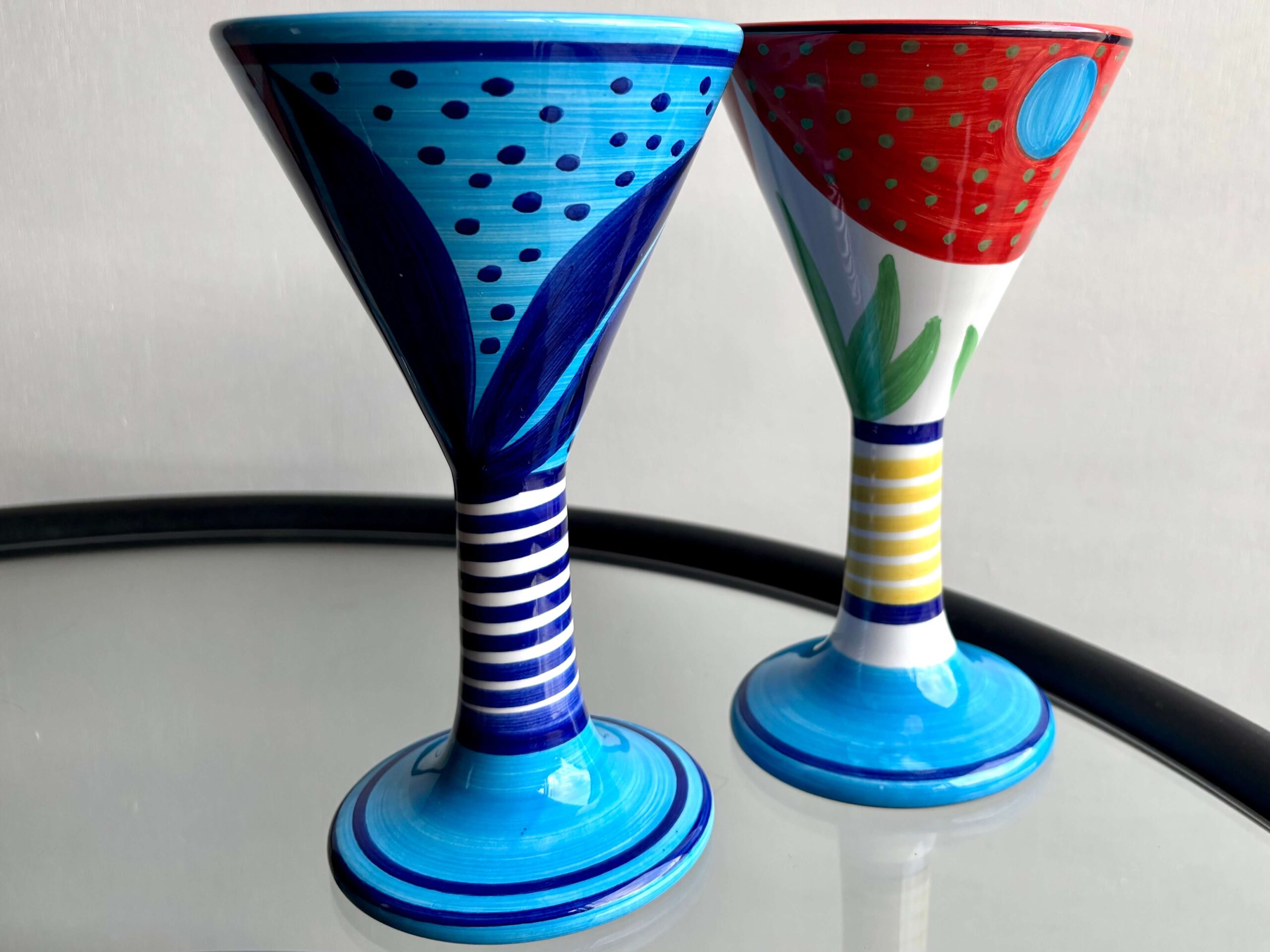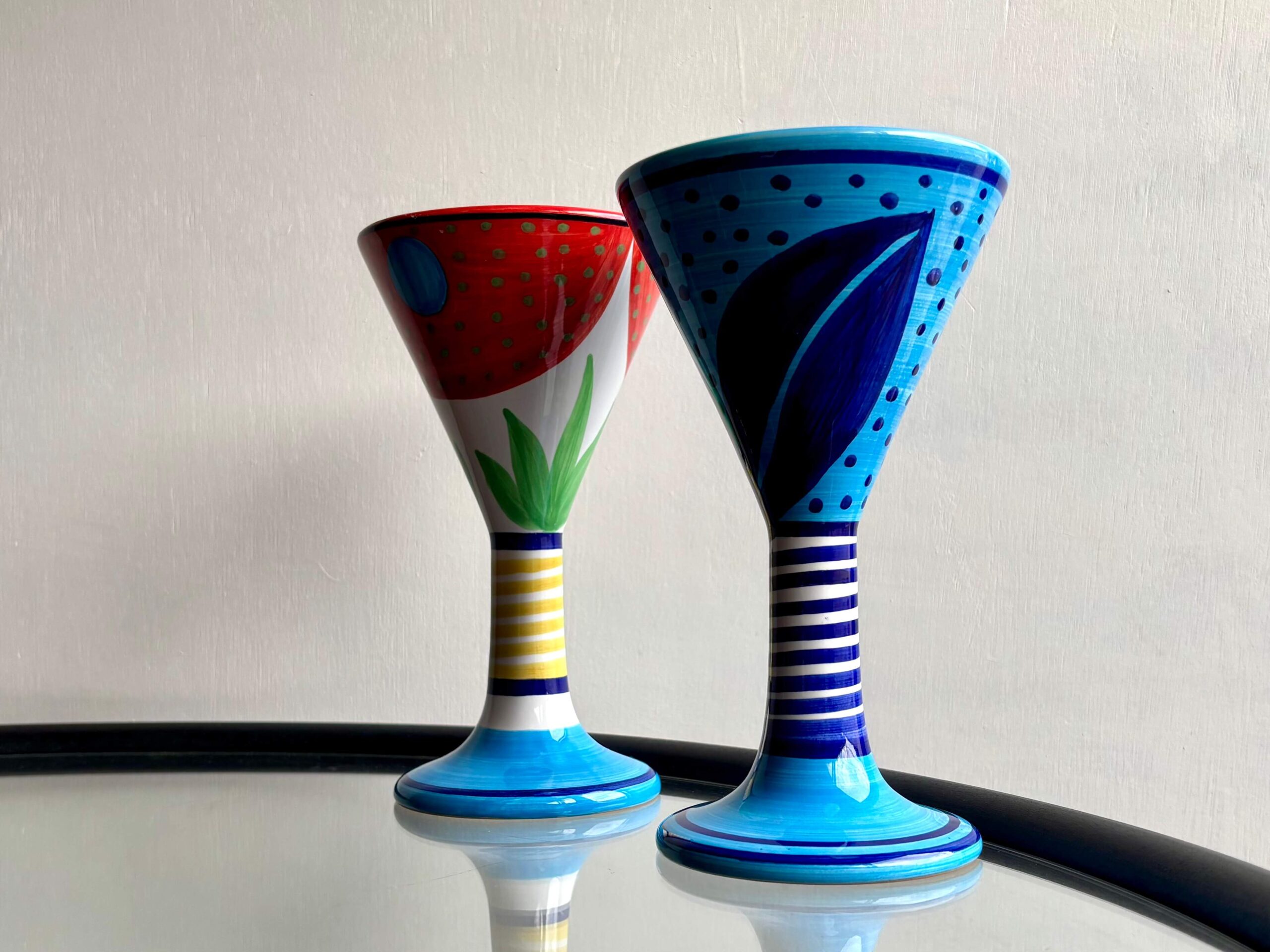 高さ19cm、ユニークなパターンと色鮮やかさが目を惹くゴブレット2種。