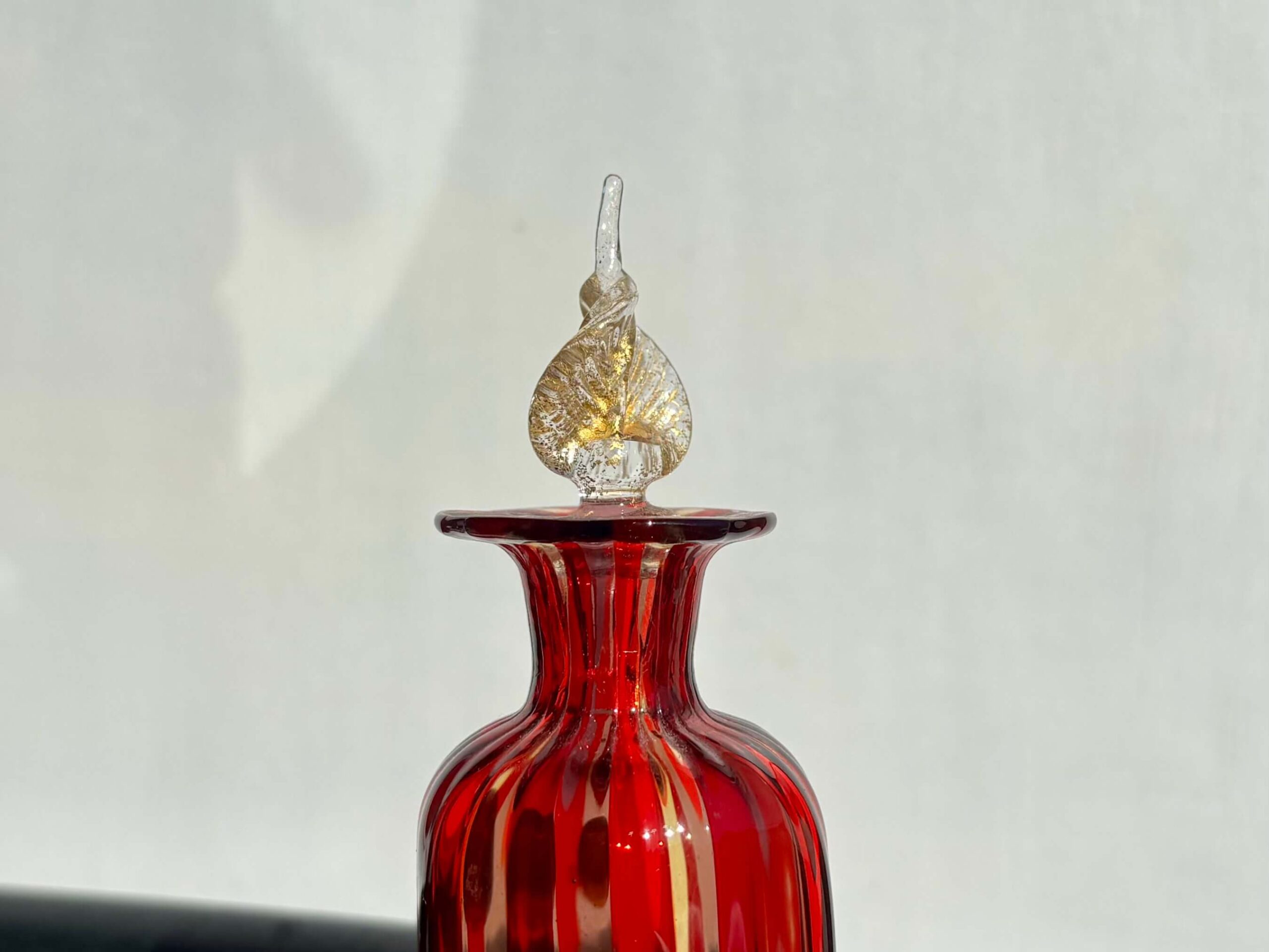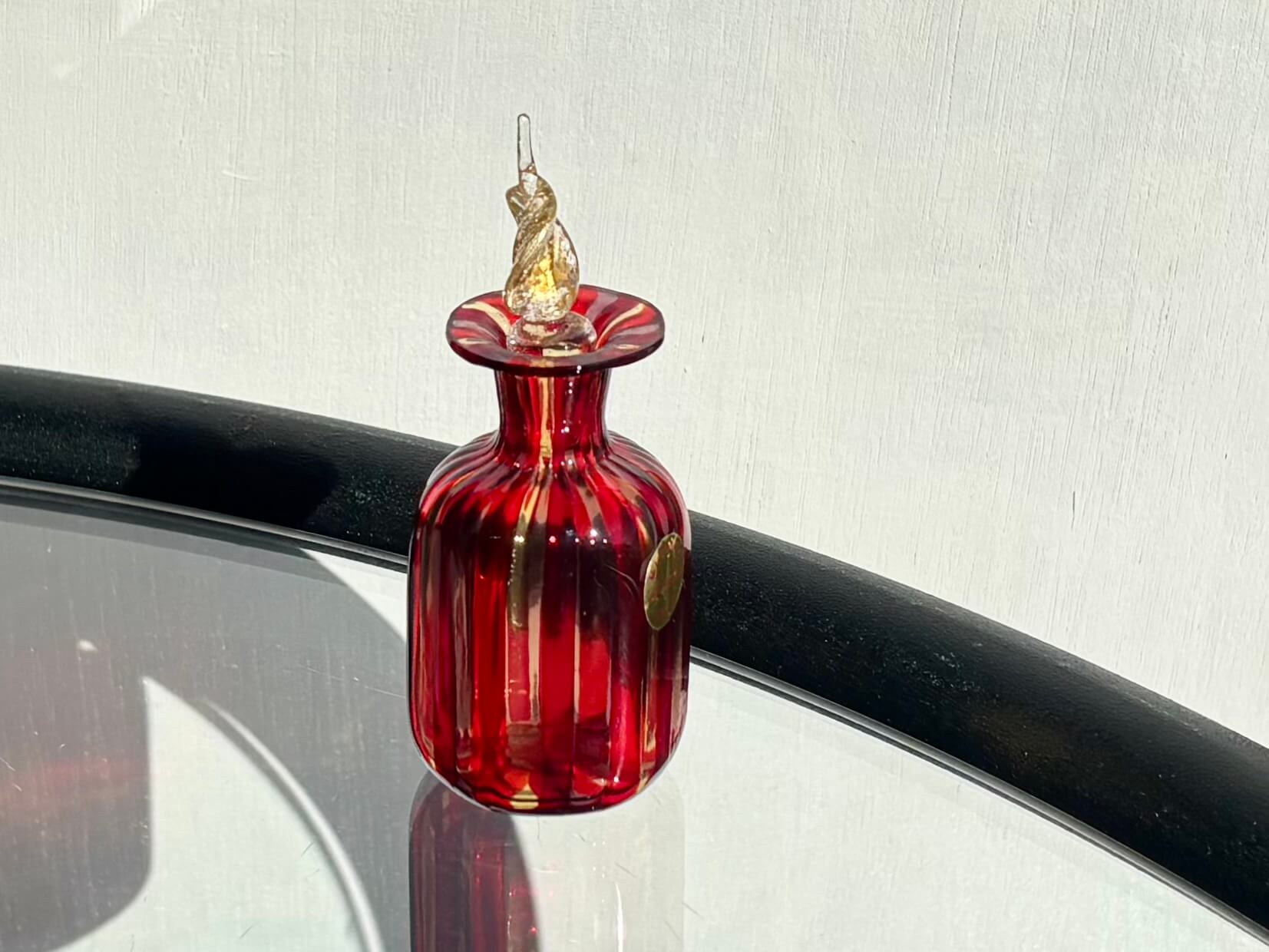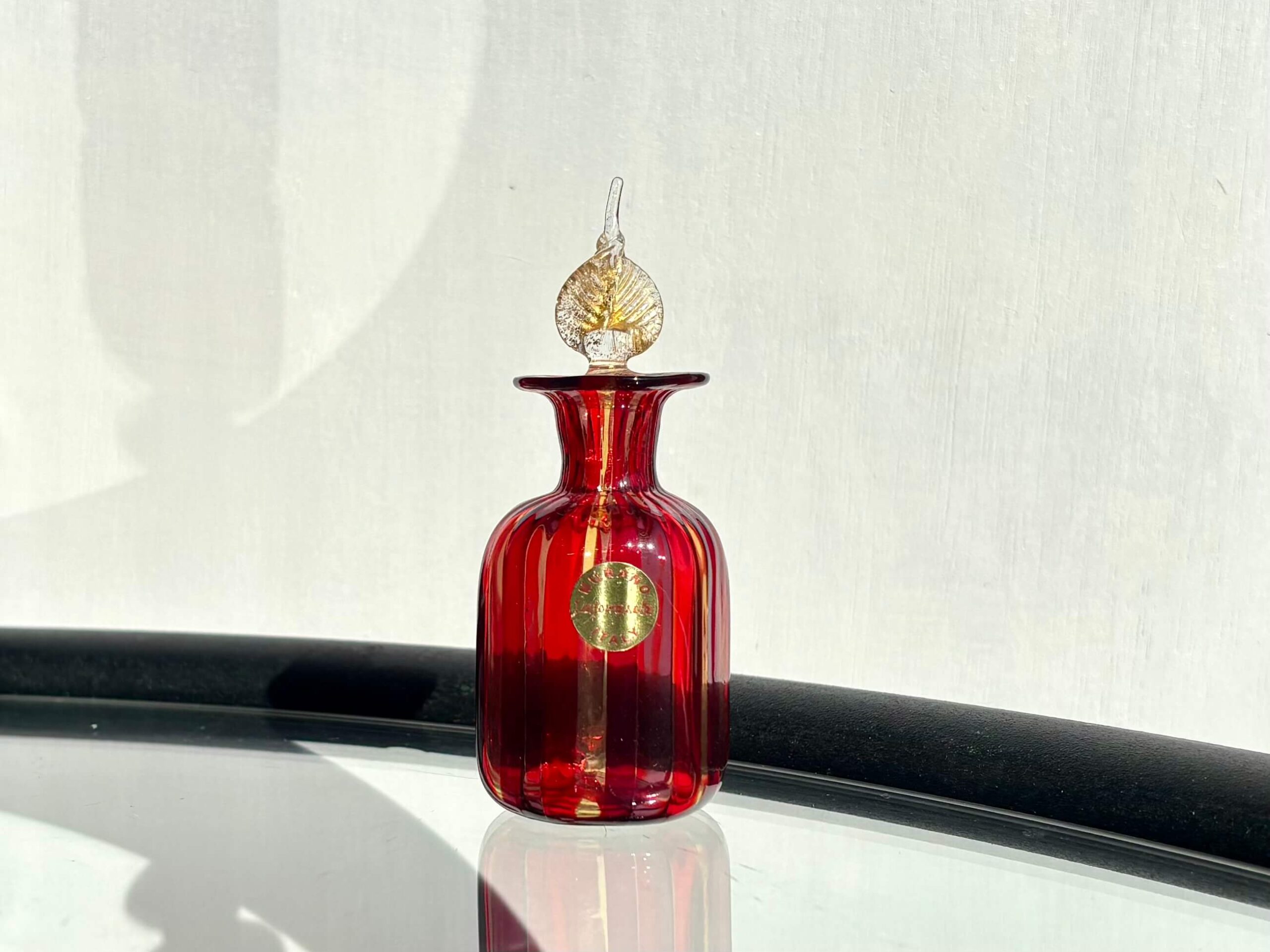 ストライプの赤い六角形ボトルにゴールド装飾された栓が映えます。