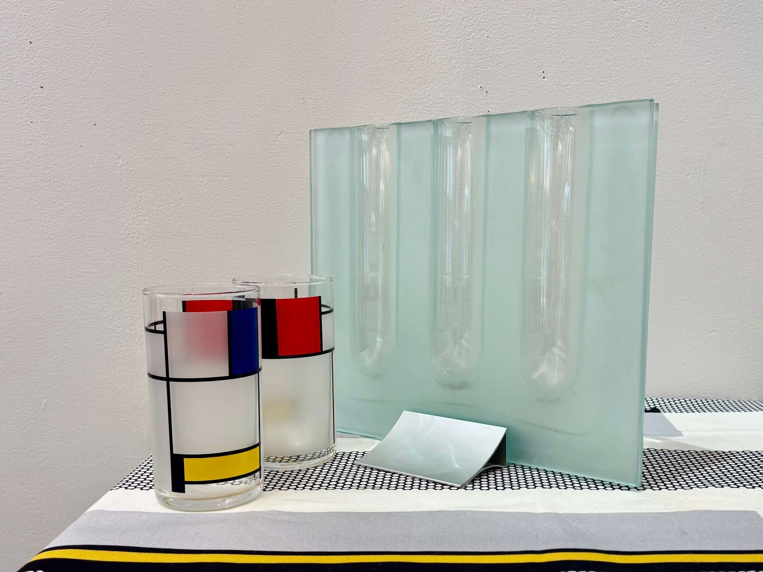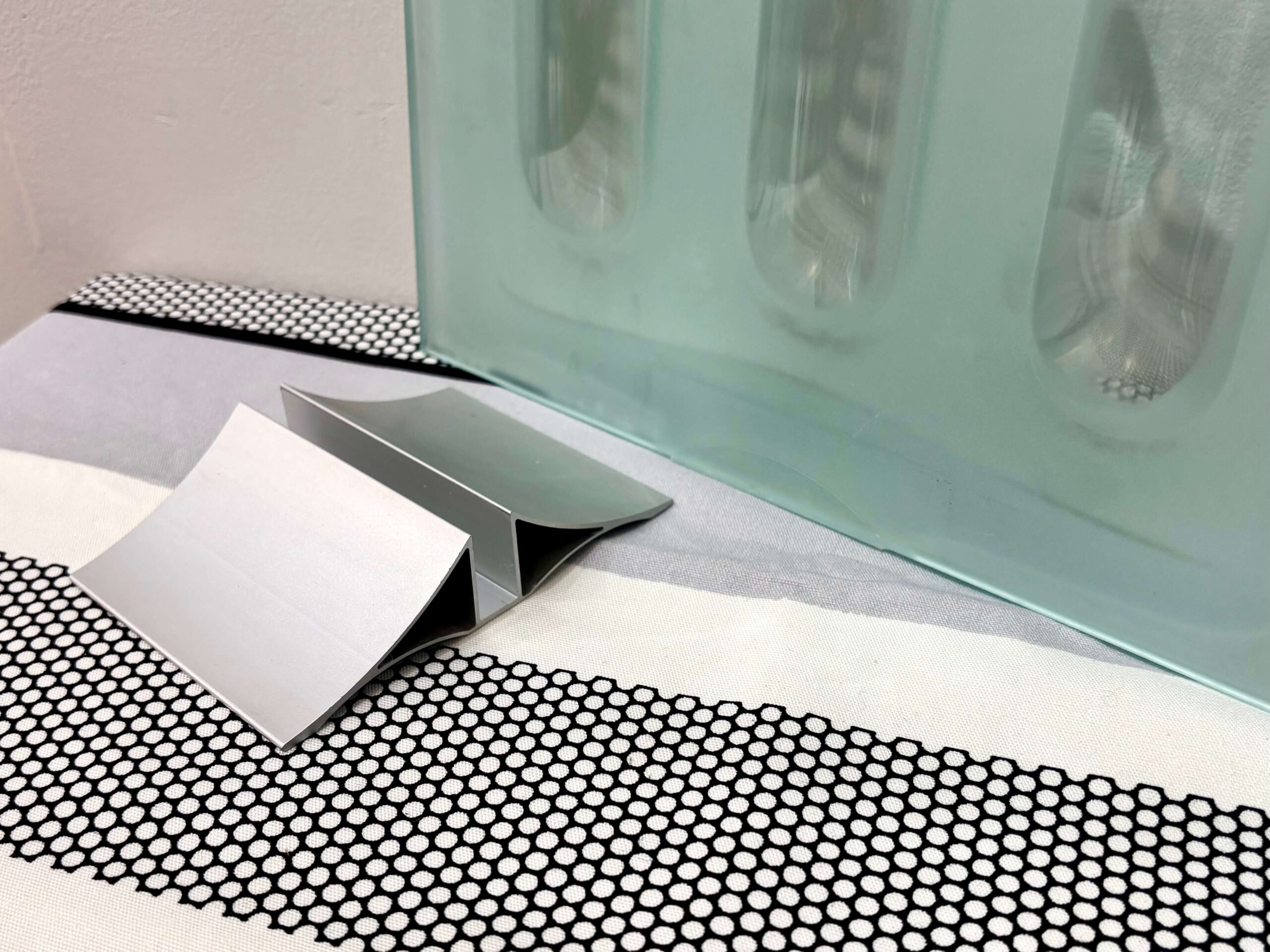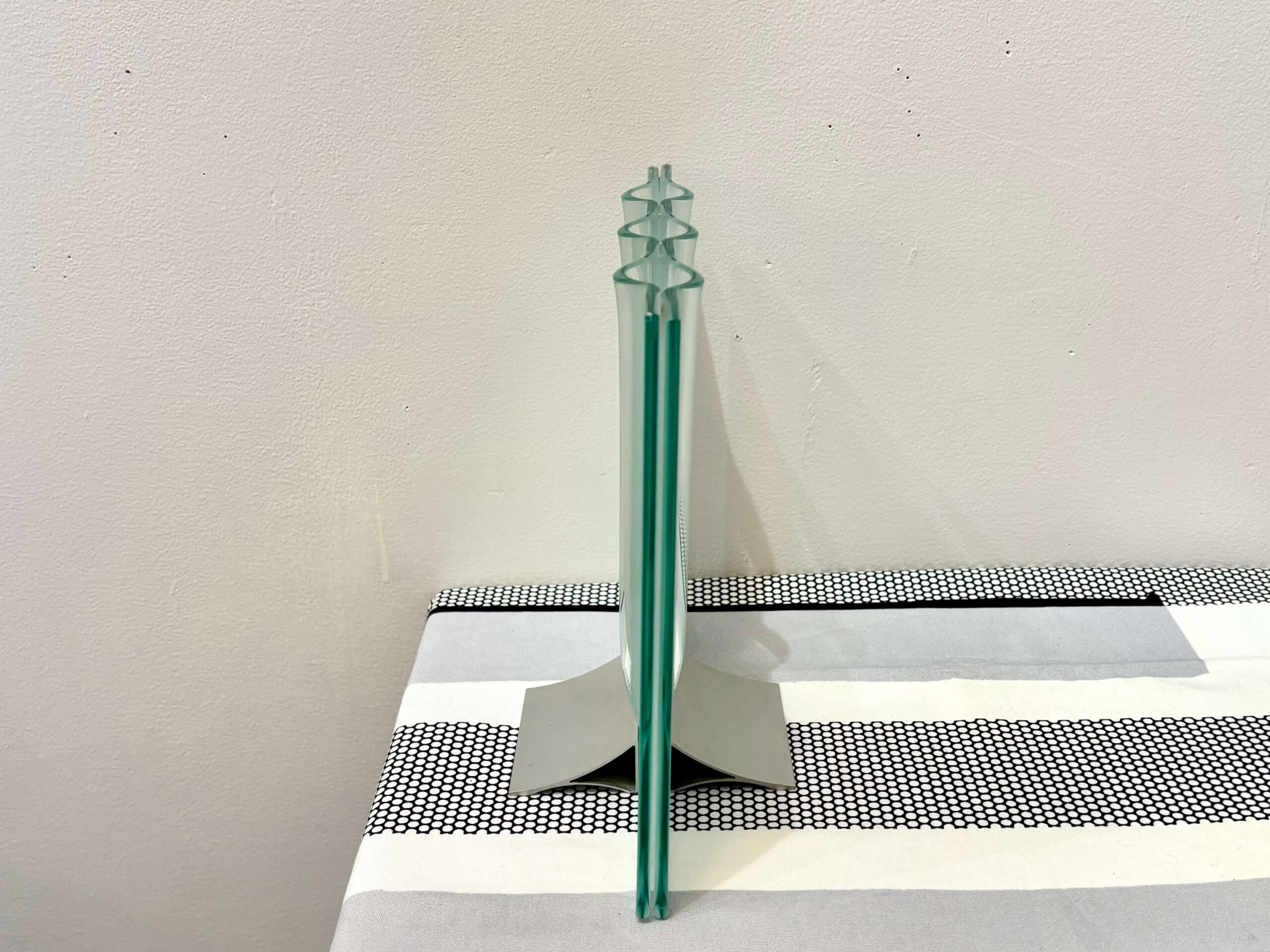 2枚のガラス板で挟み、ふくらんだ箇所が左右合わさり水受け3箇所に。