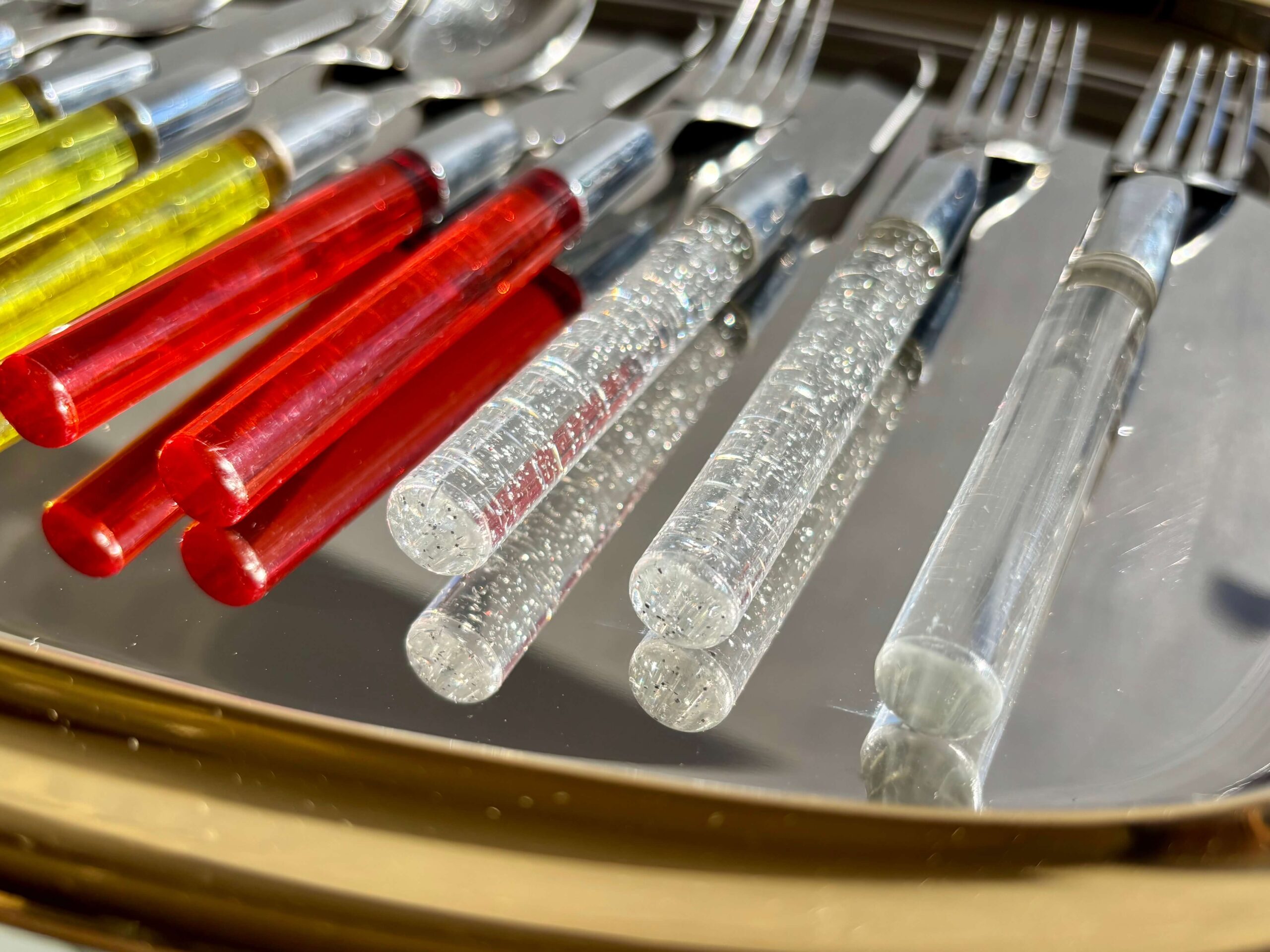 ラメ、赤色はナイフ、フォーク各1本、クリアはフォークのみ。