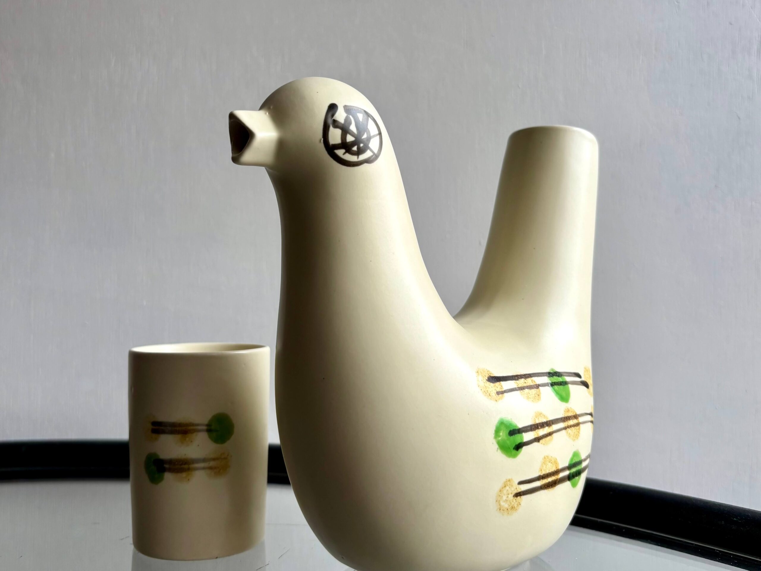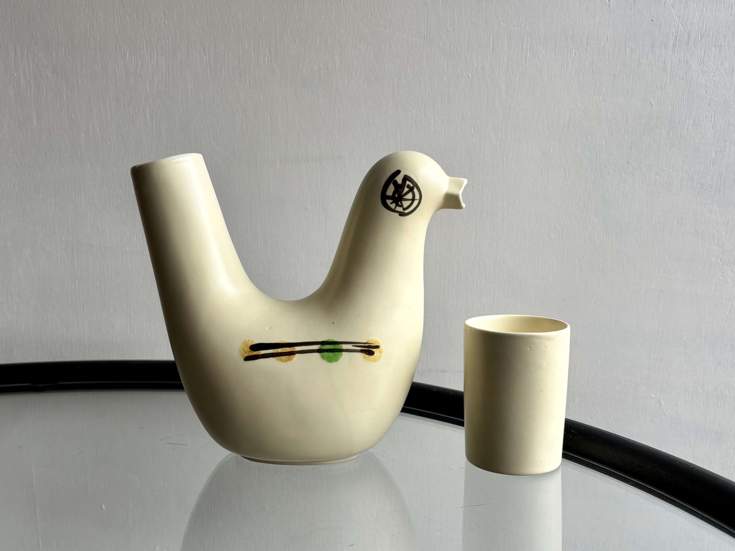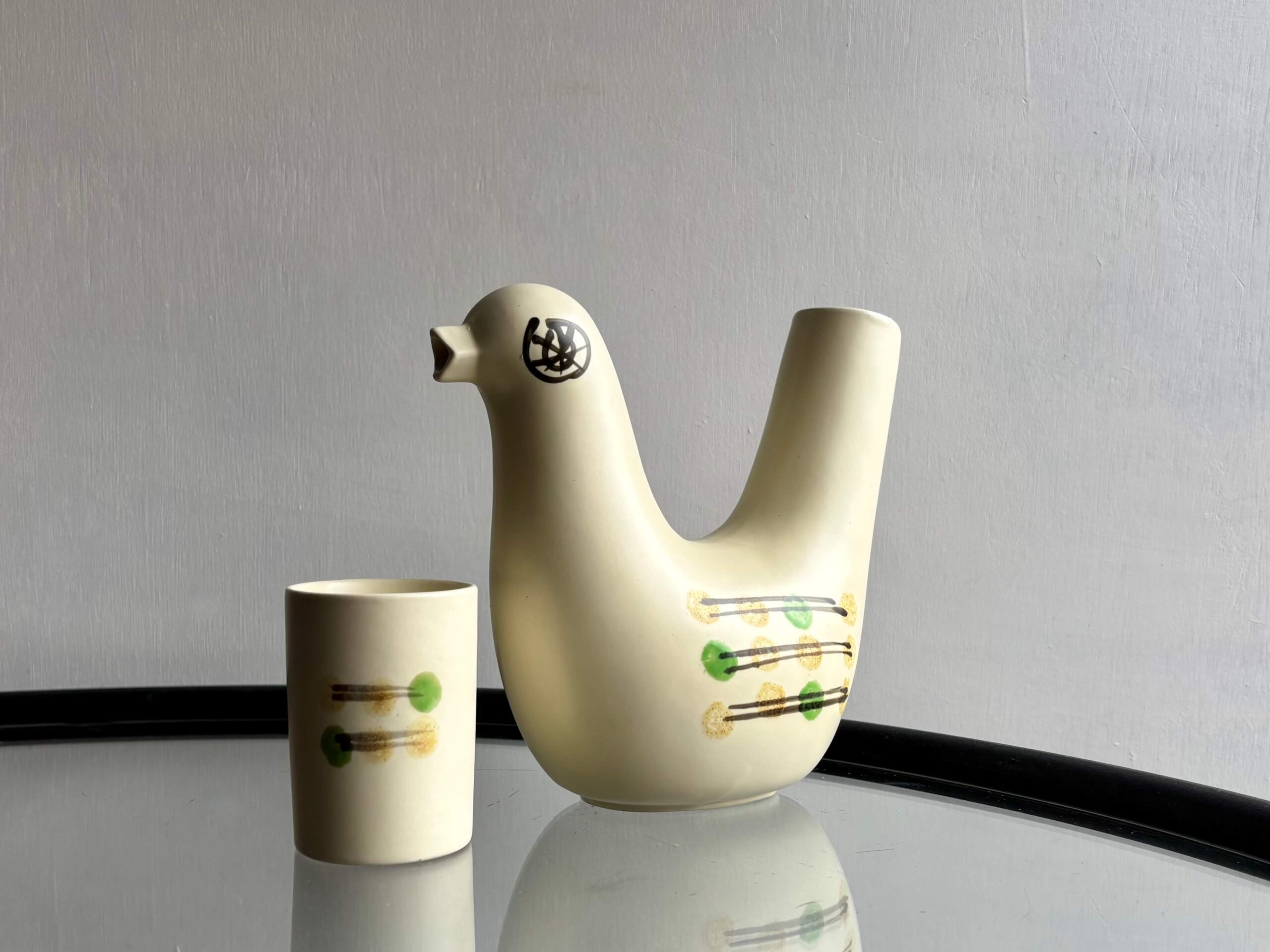 愛嬌のある表情をしたトリの水差しとタンブラーがセットになっています。