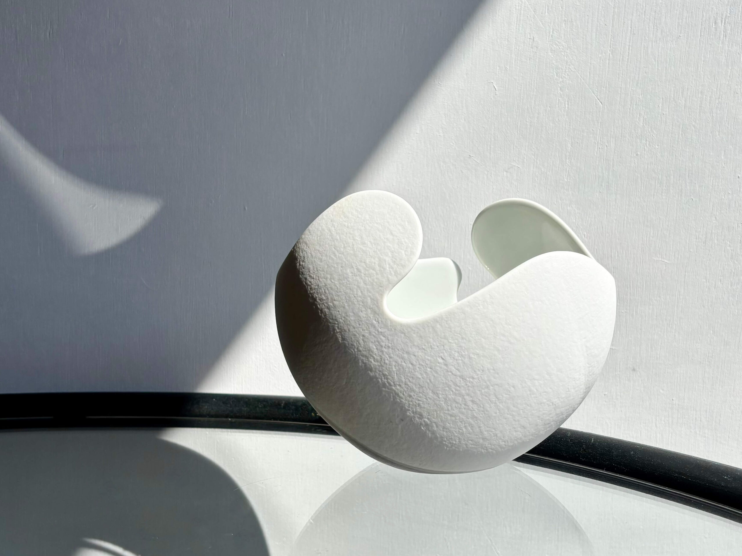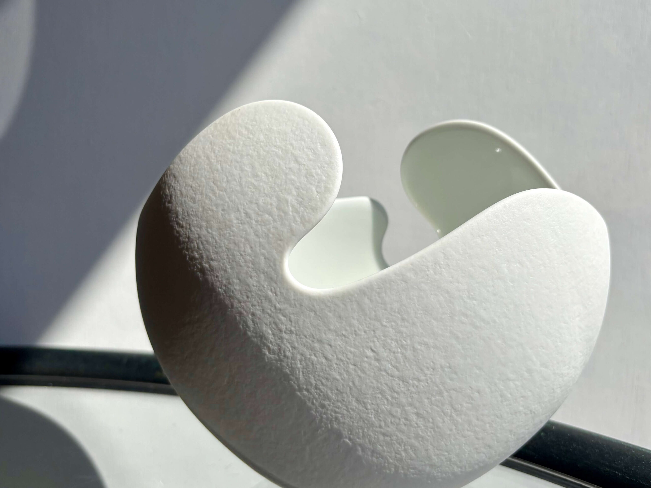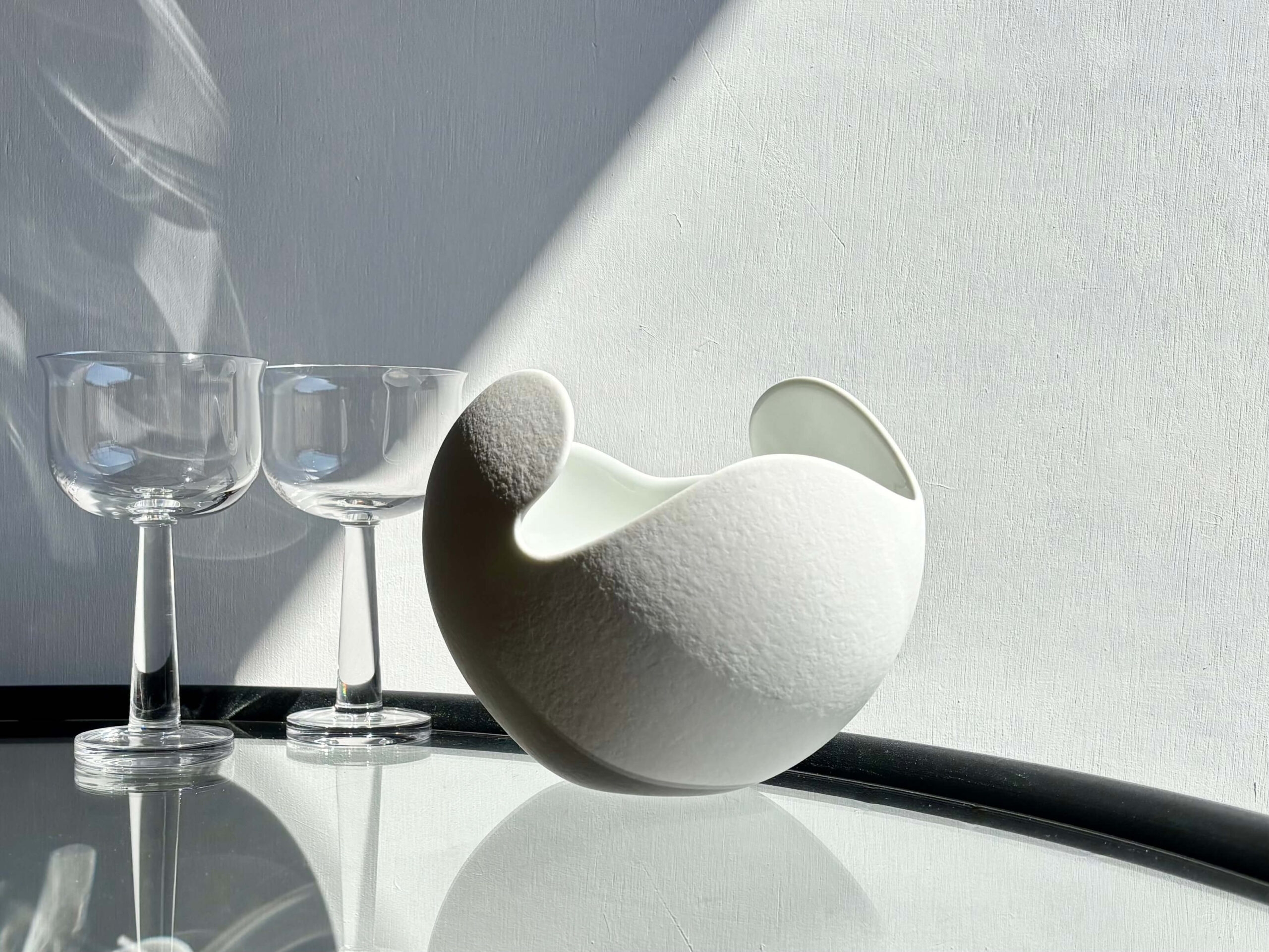 有機的なフォルムが印象的な花器、前後で異なる形状をしています。