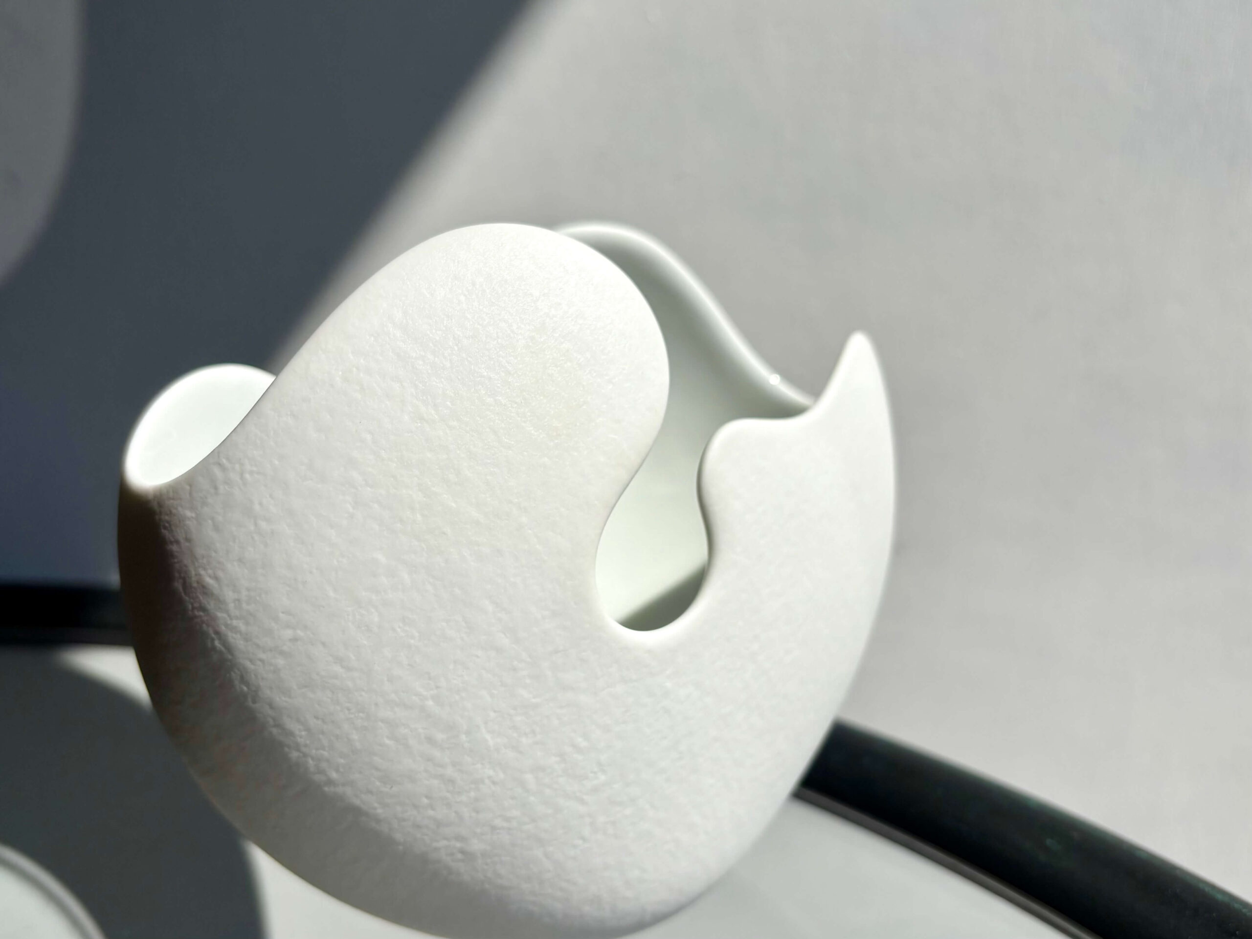 有機的なフォルムが印象的な花器、前後で異なる形状をしています。