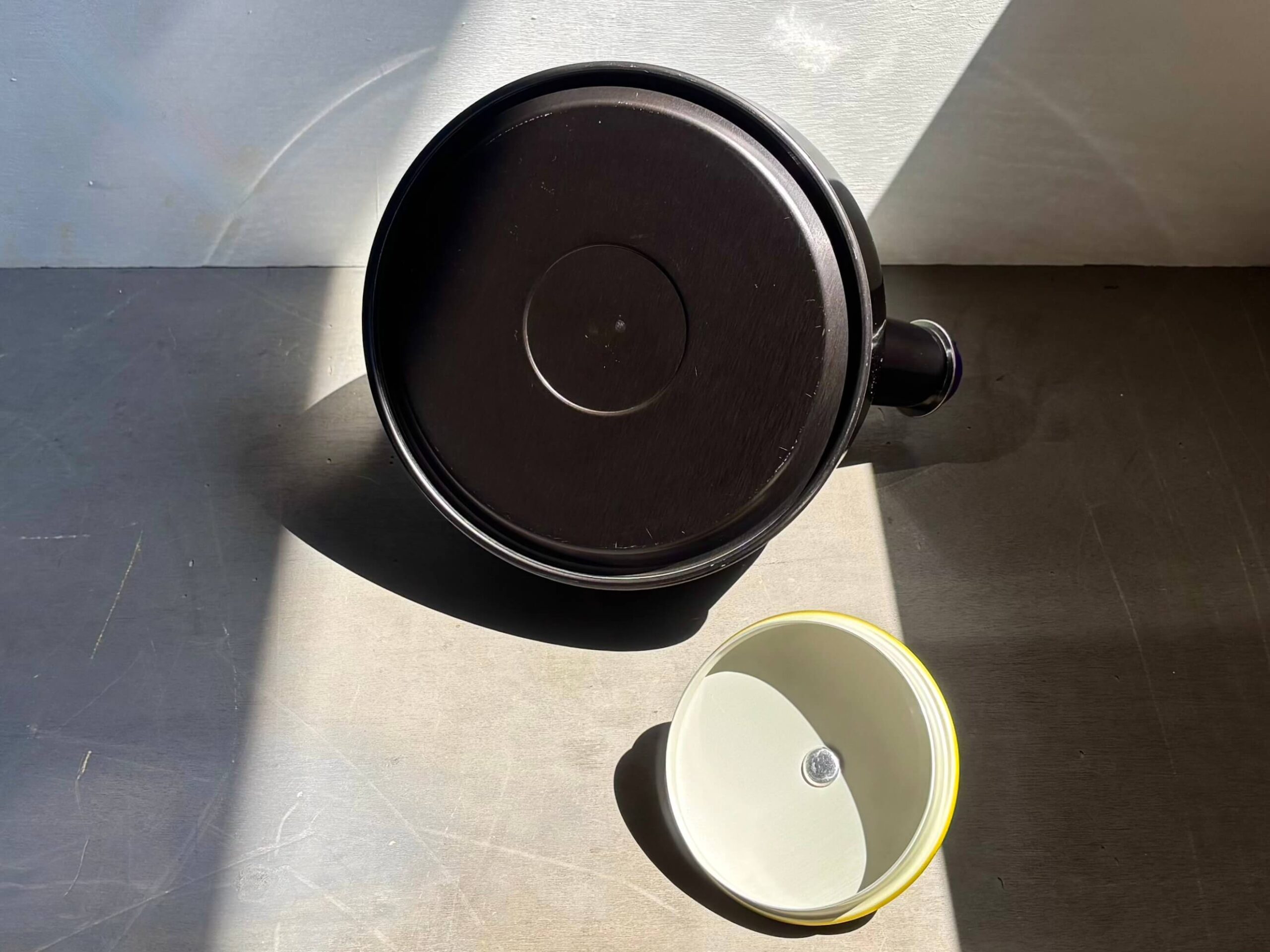 本体はブラッック、持ち手は深いグリーン、フタはイエロー、吹き口はパープル!