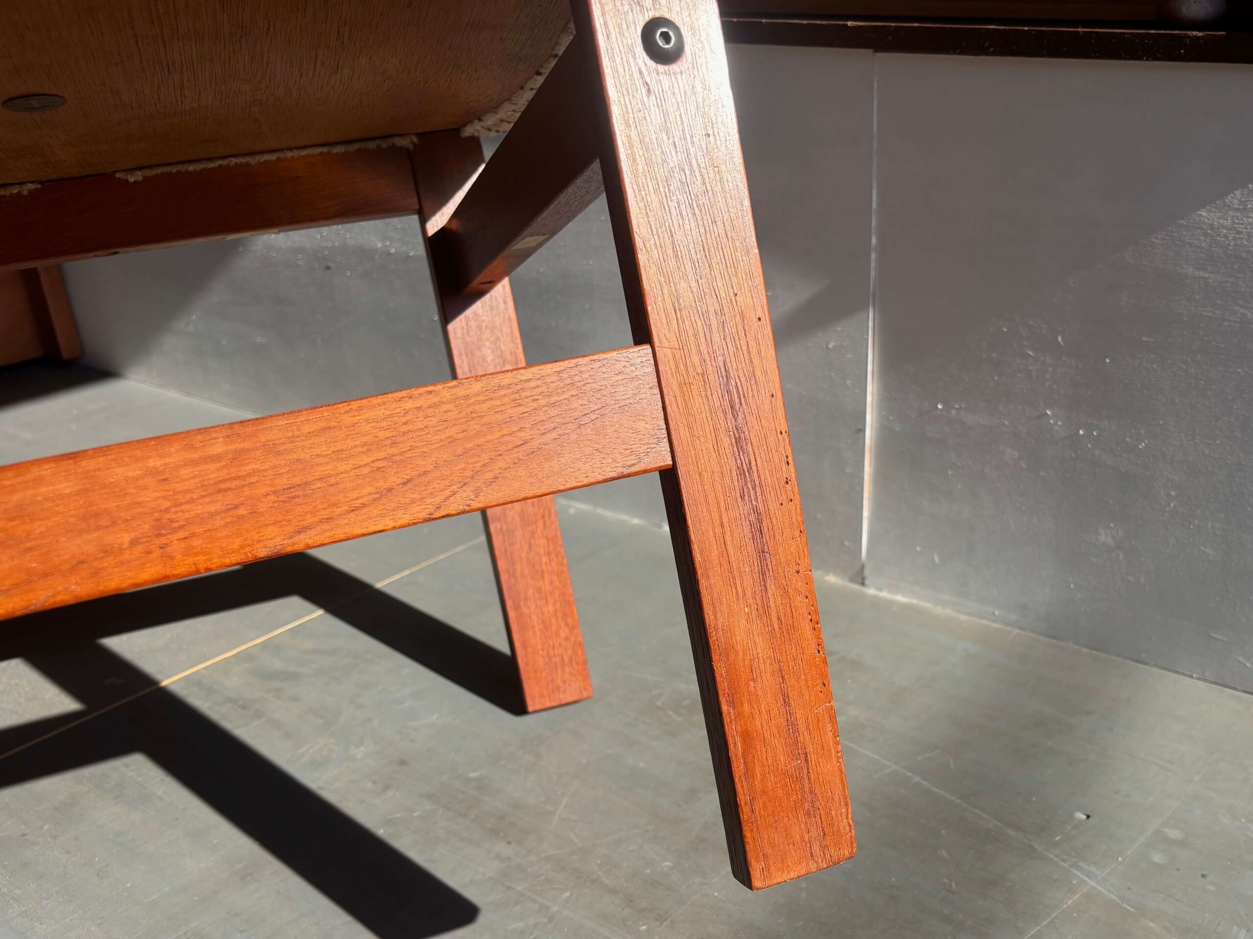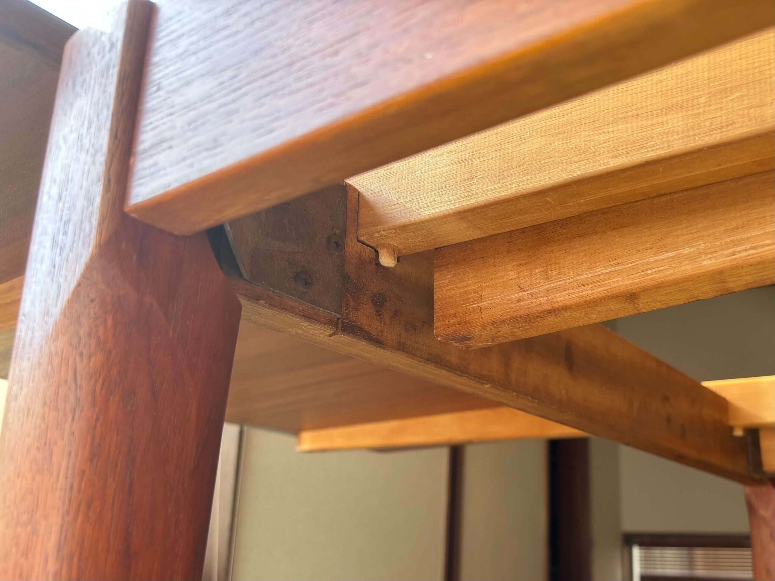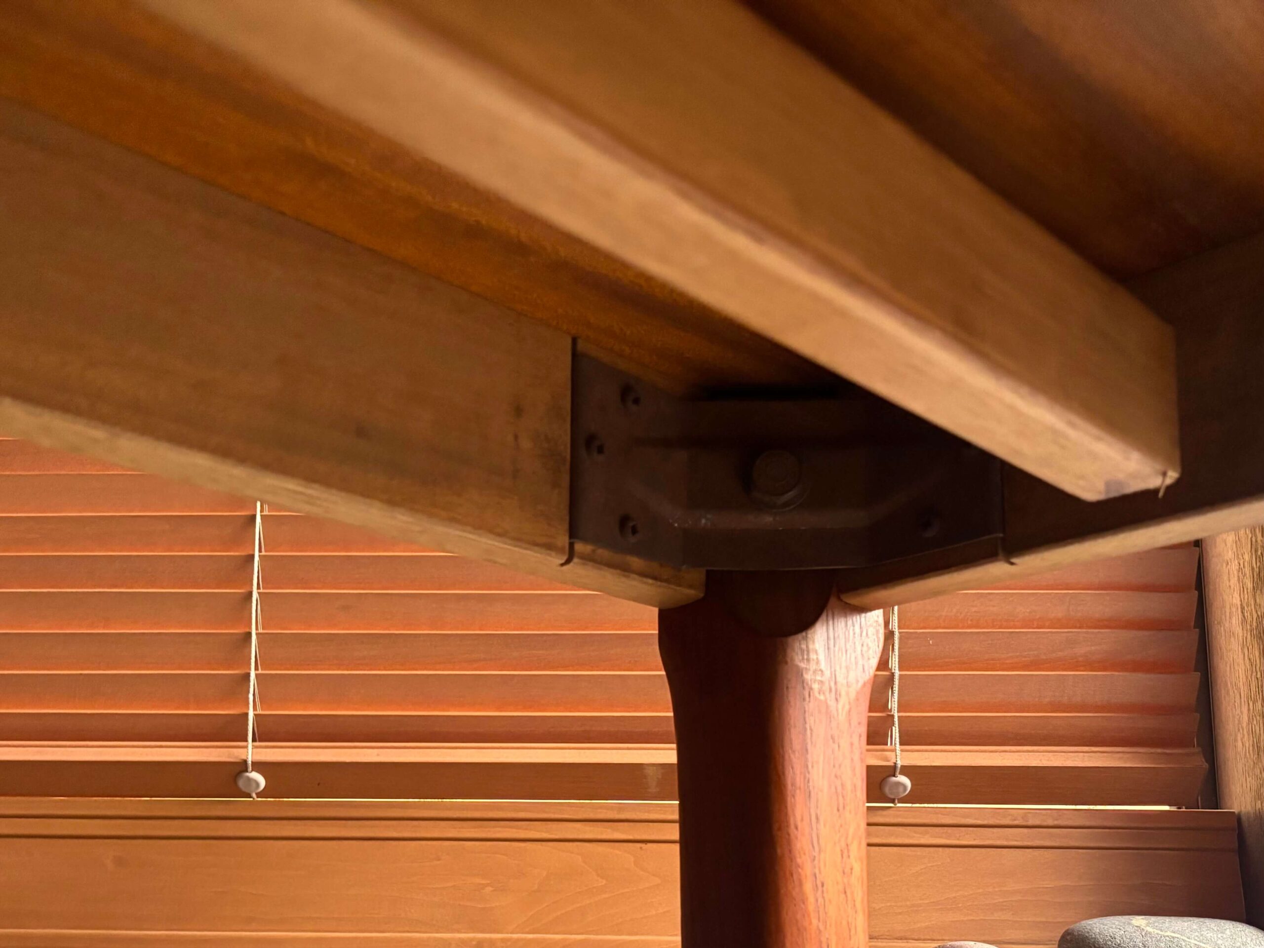チェア5脚いづれも後ろ脚に補強のためビス打ちされ、その上にチーク材のキャップが嵌められています。
