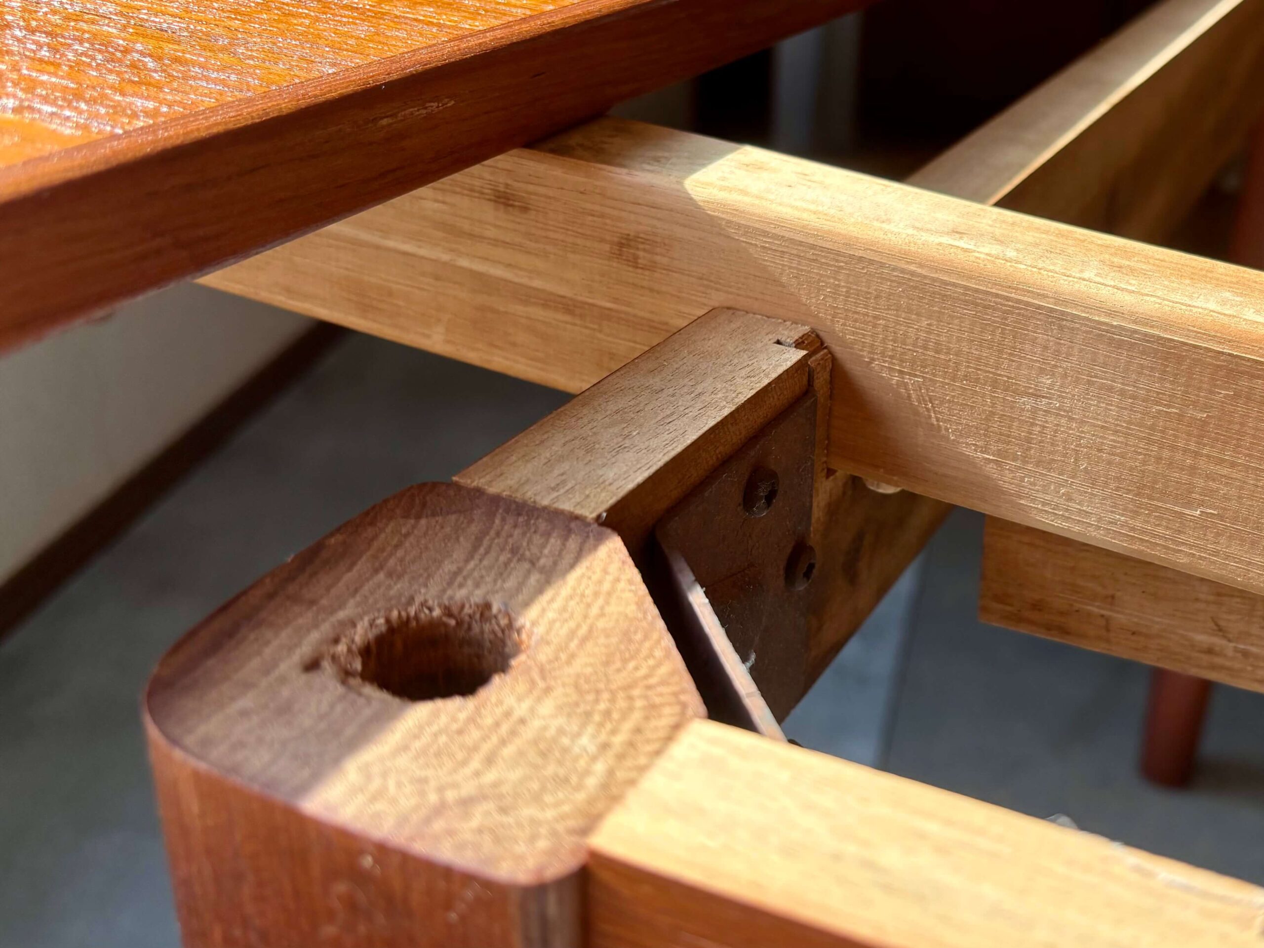 チェア5脚いづれも後ろ脚に補強のためビス打ちされ、その上にチーク材のキャップが嵌められています。